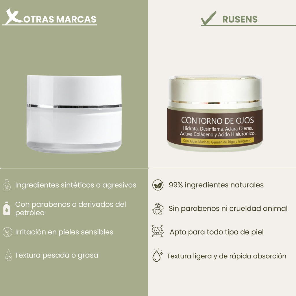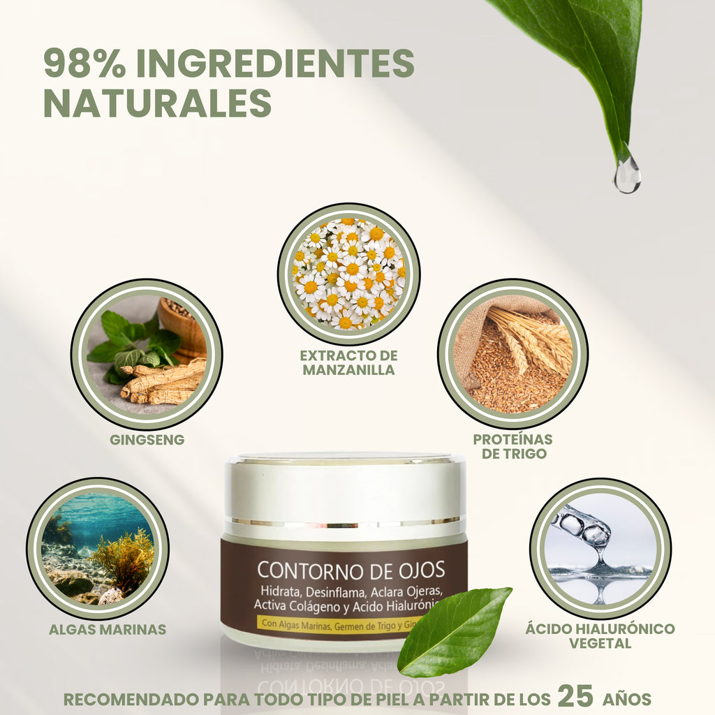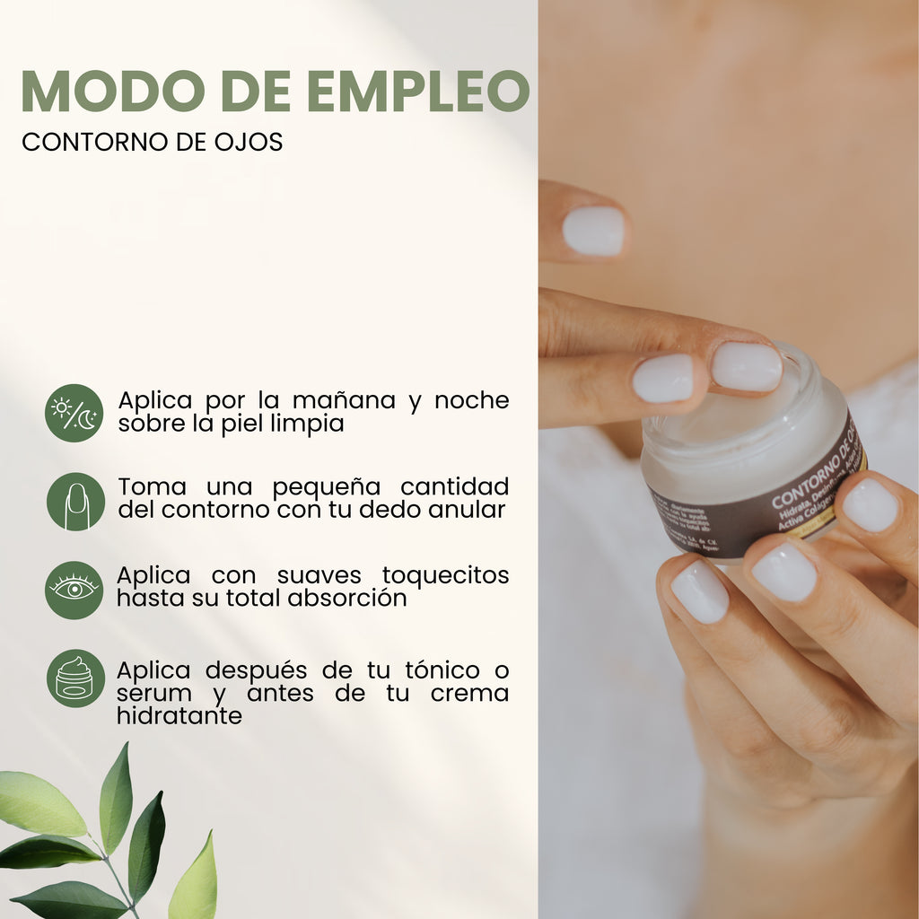 El contorno de ojos, es ideal para desinflamar bolsas, reducir ojeras y atenuar líneas de expresión. Ofrece un cuidado delicado y efectivo, proporcionando hidratación y frescura al contorno de los ojos.